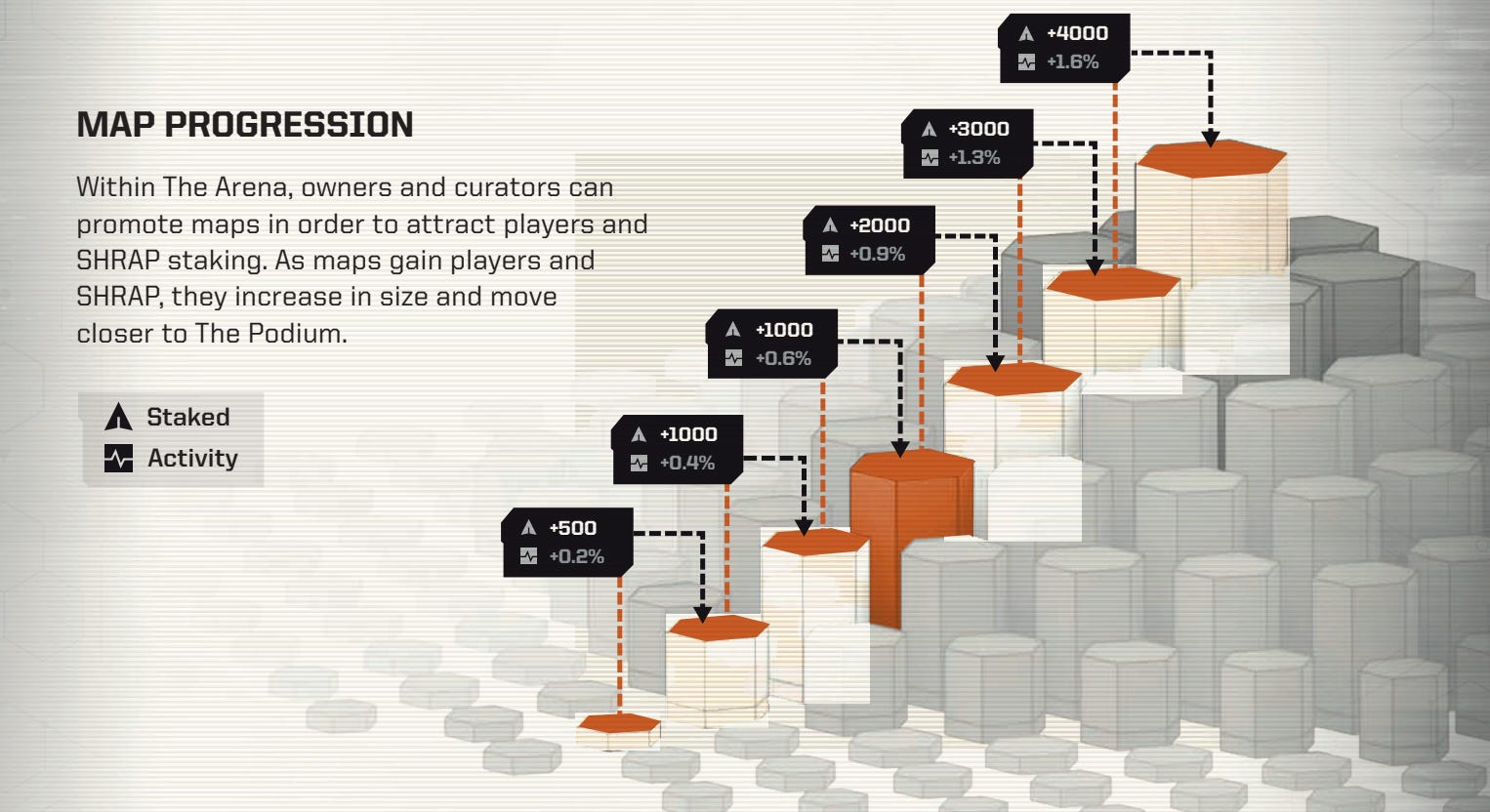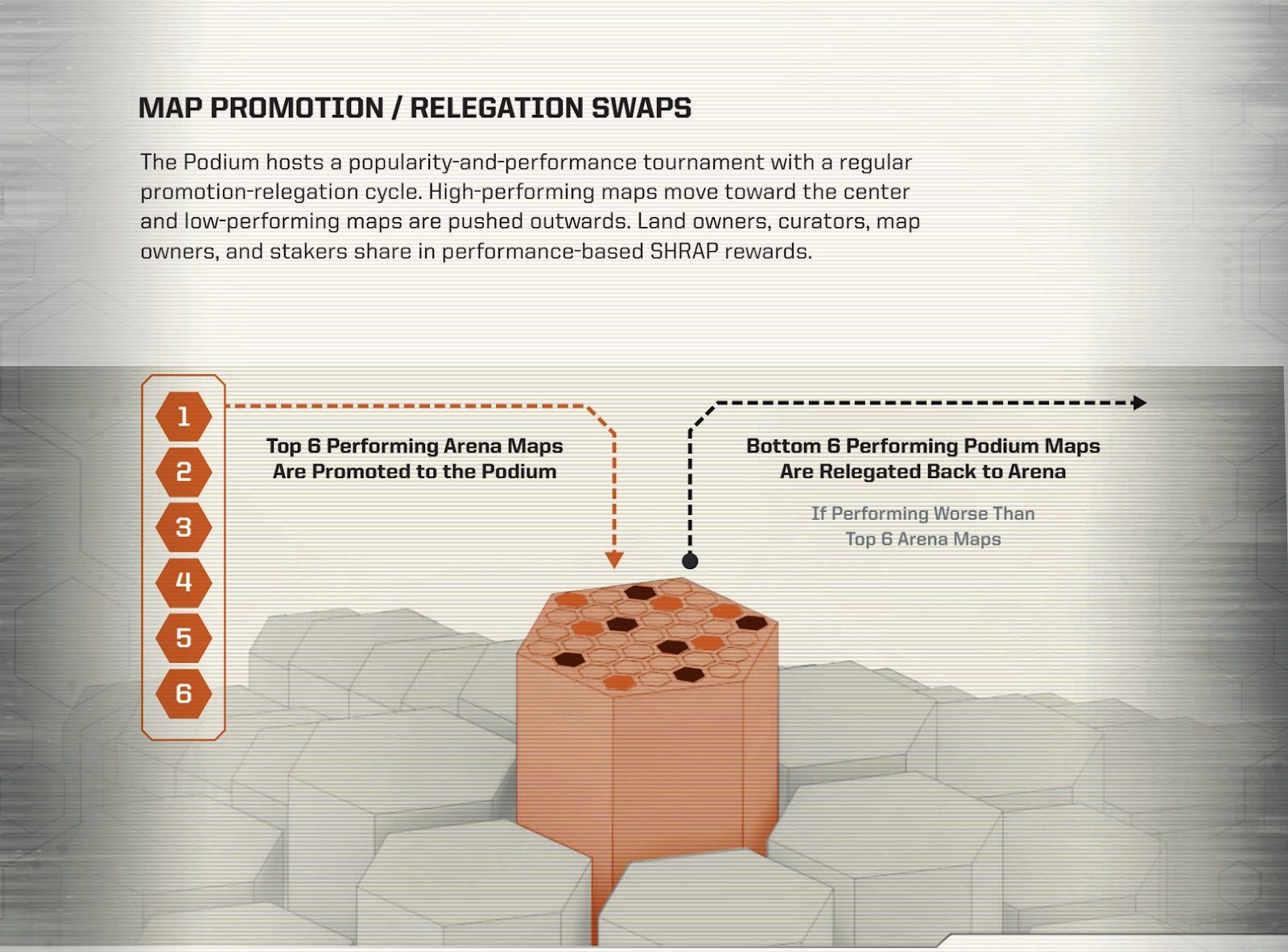 Arena to Podium Land: It’s best to think of these competition lands as esports franchise slots - such as the Call of Duty League. There is an initial buy-in and expected earn rate. The competition lands must compete to reach “Podium Status” which allows for more earnings as that land will become a popular player map. Each competition land can work like a map selection slot.