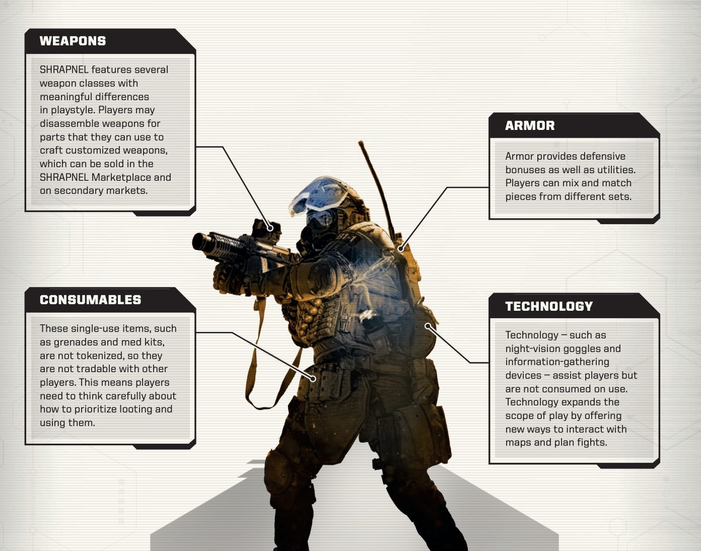 Players: Players play the game and fight against each other for gear which can then be sold on the Shrapnel marketplace to potential buyers. Similar theme to collecting and selling CSGO skins. We aren’t clear on if the marketplace only holds cosmetics or game-altering items that may cause game balance issues.